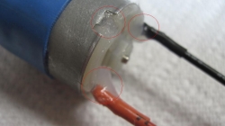 After adding the wires (and the capacitor if wanted), I add a little more Goop around each terminal to support the leads. This takes the strain off the