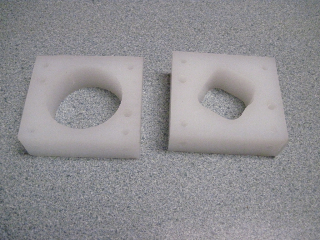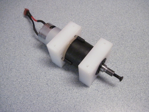 These blocks are routed from 3/4" UHMW to neatly mount the Motor/Gearbox from a Harbor Freight Cordless Drill. Mounting holes are provided on the face and tpp/bottom to